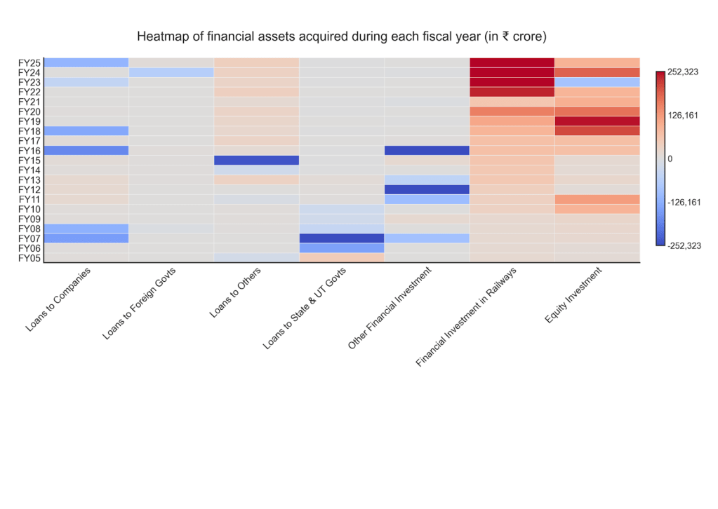 The heatmap of financial assets acquired during the year reveals a highly concentrated and instrument-led pattern of capital deployment, rather than a broad-based expansion across categories. A small set of components, most notably investments in railways and equity, account for the bulk of variation over time and largely determine the scale of financial asset acquisition. These instruments display clear phases of acceleration, particularly in the post-FY2020 period. Over successive five-year intervals, the CAGR of total financial assets rises from 6% and 5% in FY2005–10 and FY2010–15 to 14% and 13% in FY2015–20 and FY2020–25, driven disproportionately by a surge in equity investments, with CAGR peaking at 27% in FY2015–20, and a steady increase in railway investments, reaching 21% by FY2020–25.
