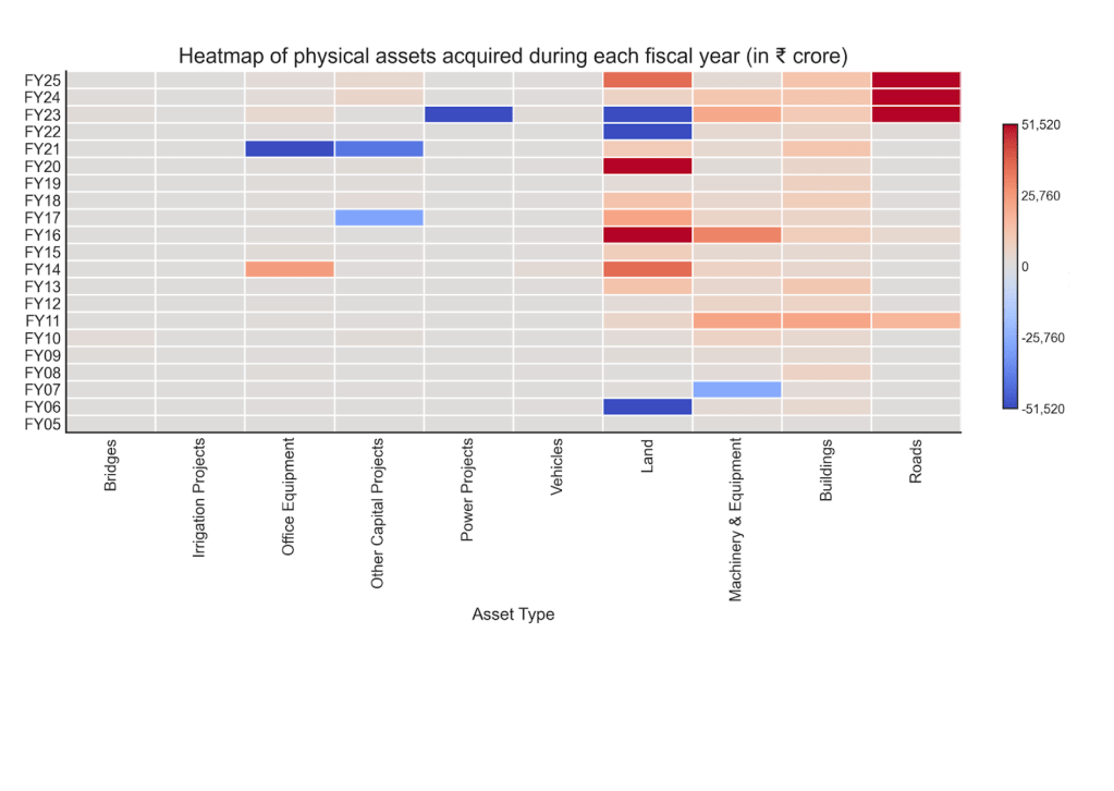 The heatmap of physical assets acquired during the year points to a concentrated and uneven pattern of infrastructure creation, where a few categories disproportionately shape overall trends. In particular, roads have emerged as the primary driver in recent years, with a sharp escalation post FY2022-23 that accounts for a large share of the increase in total physical assets. This is reflected in growth patterns as well. When examined using five-year interval CAGR (FY2005-10, FY2010-15, FY2015-20 and FY2020-25), overall physical assets rise from 7% and 6% in the first two intervals to 16% and 14% in the latter two, alongside a pronounced shift in road investments- from a contraction of -4% in FY2010-15 and subdued growth of 3% in FY2015-20 to a sharp surge of 101% in FY2020–25. Land also exhibits significant but highly volatile movements, including large positive spikes (e.g., mid-2010s and FY2020-21) alongside negative values (sale) in later years. Machinery and equipment show intermittent peaks, indicating project-linked investments rather than sustained capital formation. In contrast, core infrastructure sectors such as irrigation, power, bridges, and buildings remain persistently low and relatively flat over time, with no comparable scaling. When assessed through five-year interval CAGR, bridges record a sharp one-time spike (183% in FY2005-10) before flattening to 1-2%, irrigation moderates from 15-33% to 1-6%, and power declines from 58% to -3% by FY2020-25.