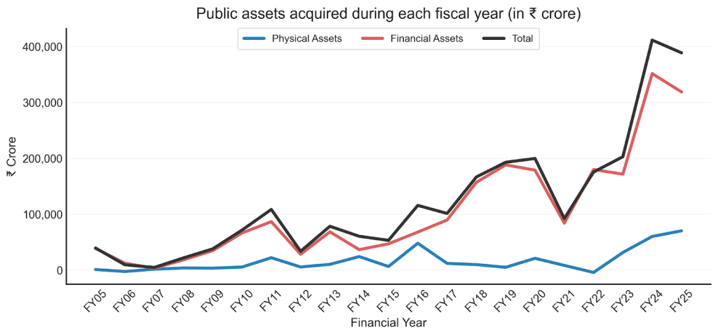Over the past two decades, assets acquired during the year have expanded substantially, rising from approximately ₹39,000 crore in FY2005-06 to nearly ₹3.9 lakh crore in FY2025-26. However, this expansion has not followed a stable trajectory. Instead, it is characterised by pronounced surges interspersed with periods of contraction, indicating that asset formation has evolved through episodic increases rather than sustained accumulation. These surges are driven by identifiable policy factors, including fiscal stimulus cycles (such as the post-Global Financial Crisis expenditure push in FY11 (₹71,334 crore, up from FY09’s ₹37,719 crore), PSU recapitalisation (contributed to the FY11 peak (₹1.08 lakh crore), including Tier-1 capital infusions to public sector banks and equity for power assets in entities like National Thermal Power Corporation), political and election cycles align with pre-poll spikes (FY11 ahead of UPA-II polls and FY19 before the 17th Lok Sabha elections), and infrastructure‑led countercyclical policy (sharp increase post FY21 amid economic recovery and Atmanirbhar packages).